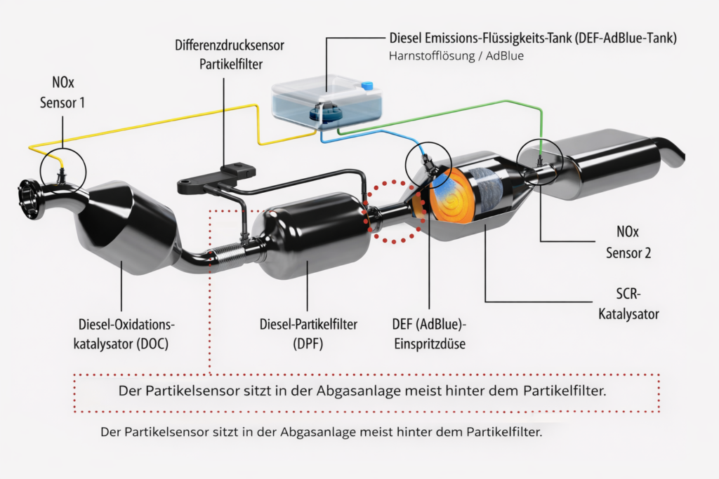 Moderne Fahrzeuge sind mit Abgasnachbehandlungssystemen wie DPF (Dieselpartikelfilter) und OPF (Ottopartikelfilter) ausgestattet.