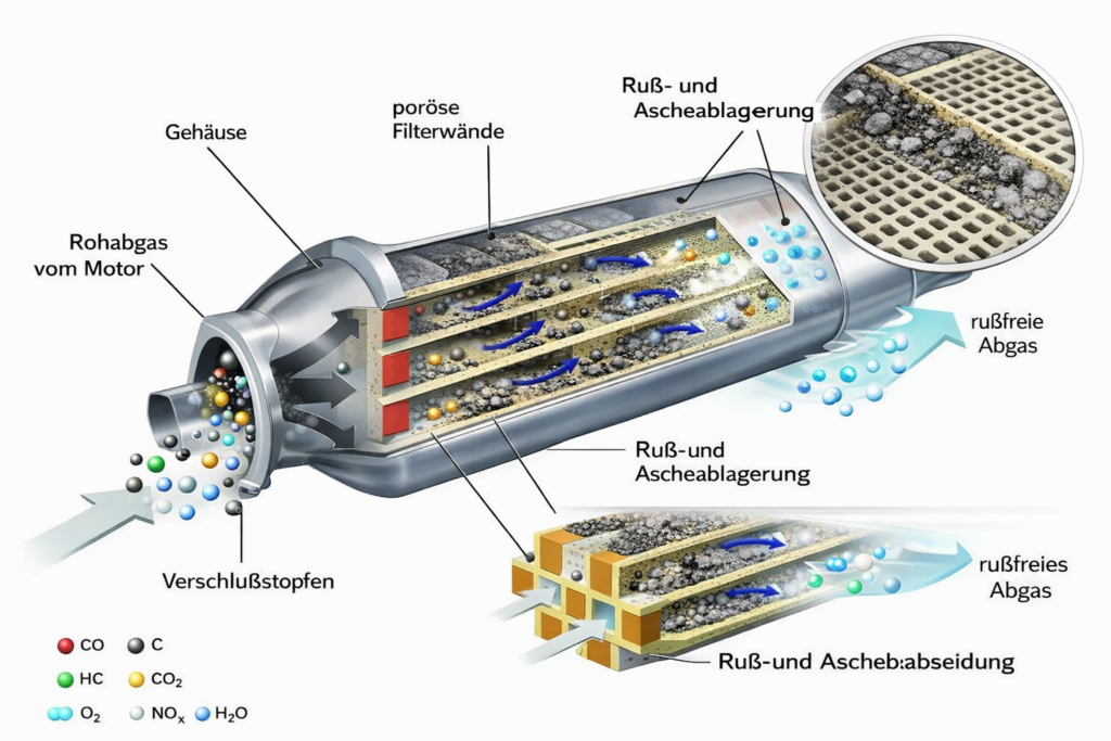 Während Ruß durch Regeneration reduziert werden kann, sammelt sich Asche dauerhaft im Filter an.